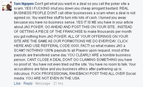 The discussion then turned to Tam Nguyen, who was a prominent spokesman for the poker site and who has since deleted any discussion he had on Facebook on the subject. In his posts, he commented how he had made quite a bit of money from his “affiliate line” (more on this in a moment) and that those who lost any money in the situation could basically pound sand (AKA they knew the risks of putting their money on the site.